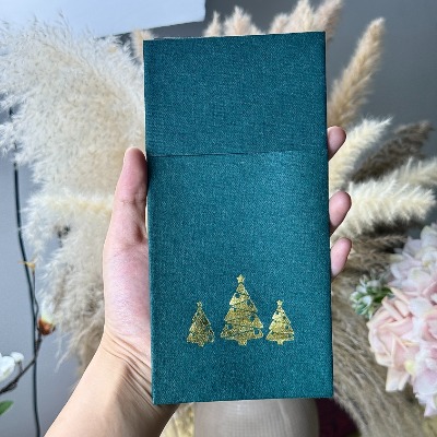 Oteller ve tatil köyleri genellikle Noel masası düzenlerinde lüks peçetelere yer verir. Tekstil benzeri dokuları şenlikli dekorla uyum sağlıyor ve tatil büfelerinin ve özel akşam yemeklerinin tadını çıkaran konuklar için zarafet duygusunu artırıyor.